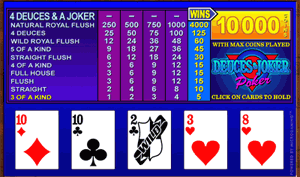 The Deuces in the deck are wild. The Deuces are cards with a face value of two. Whenever you are dealt a Deuce, it is automatically assigned a denomination and suit. The Joker and Deuces substitute for cards of any denomination and suit to complete a winning hand. This gives you the highest possible payout for the cards you are holding. The maximum payout in Deuces and Joker Power Poker is 10,000 coins.
